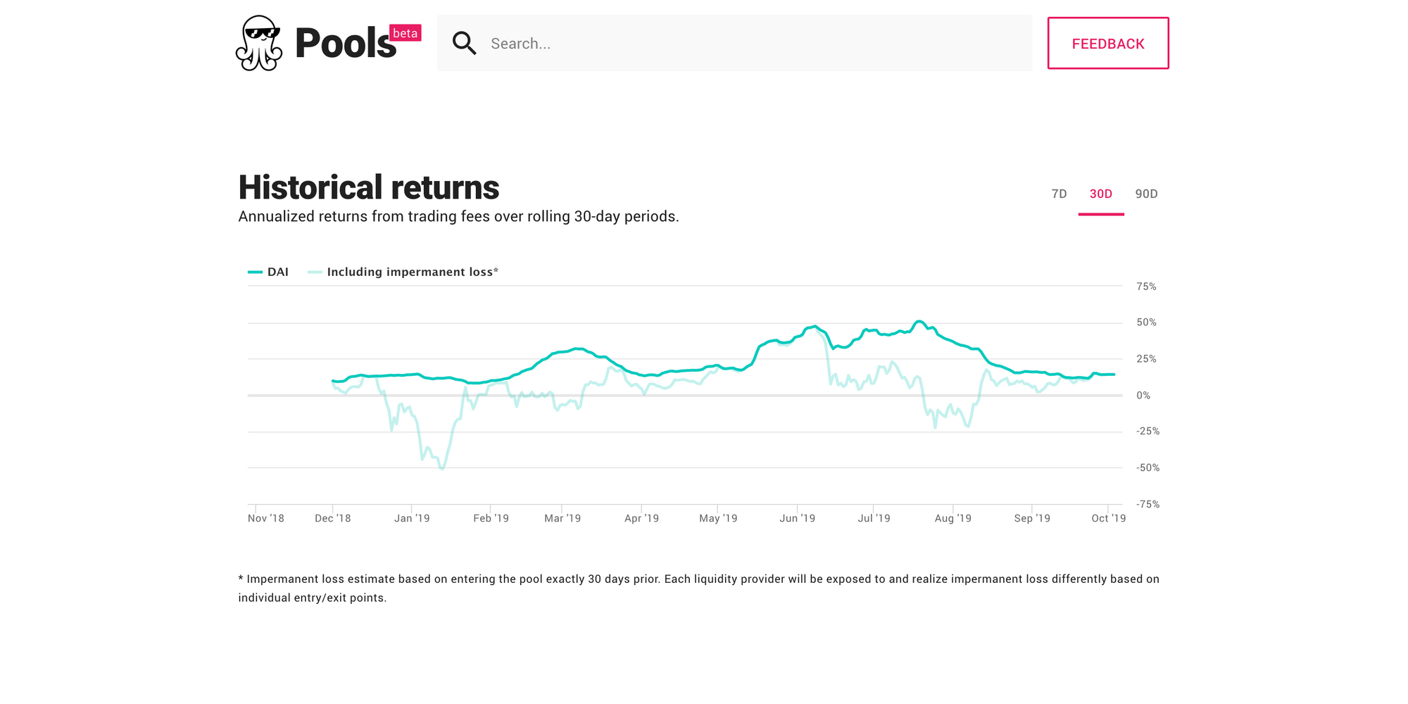 Review annualized returns for individual pools, which include an estimate of impermanent loss.